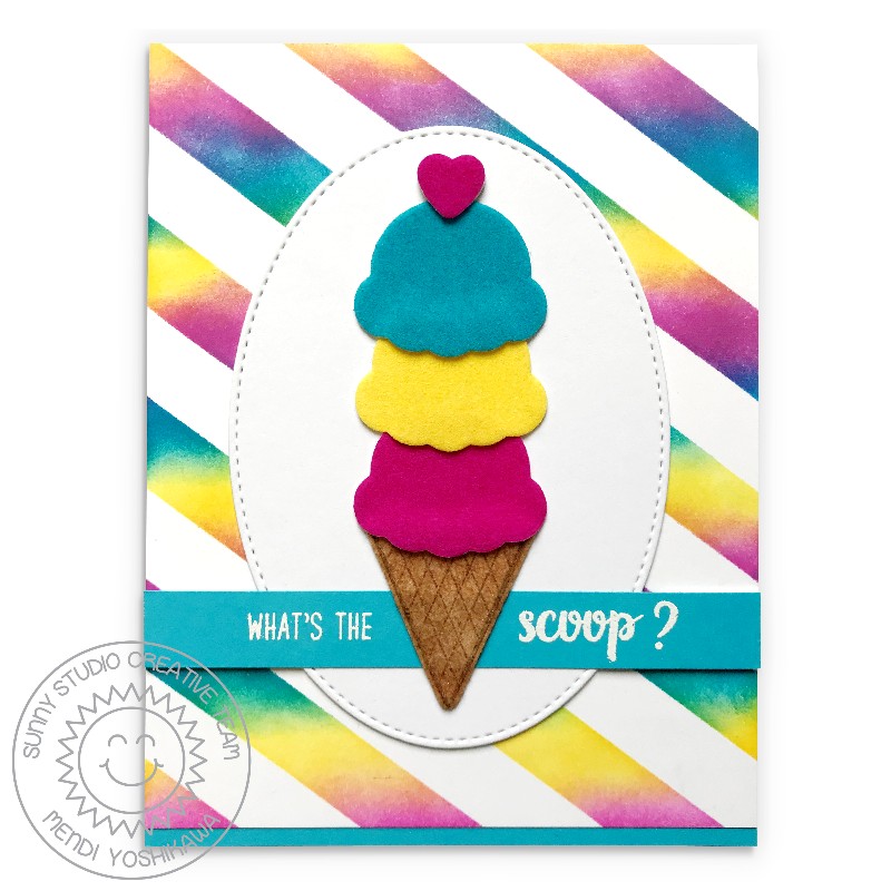 As a final touch on my card, I mounted my triple scoop cone on a Stitched Oval and heat embossed the sentiment "What's the Scoop?" with white powder using stamps from our Two Scoops Set.