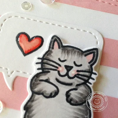 I colored my cat with Copic markers, die-cut him with the coordinating Furever Friends dies, and popped him up on a speech bubble "pillow". His dreams are filled with love! Then I added a sentiment from the same stamp set. To finish things off, I added some clear sequins with a few tiny hearts and then popped the panel up on a white card base with foam tape.