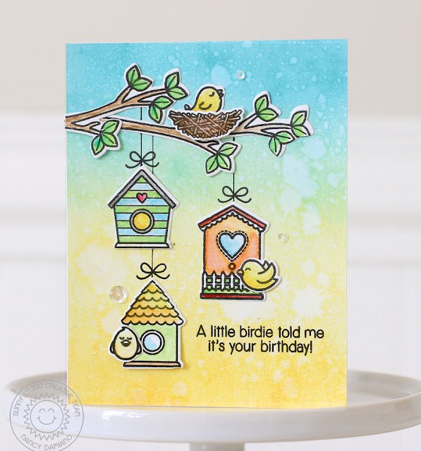 a splash of color to a few birdhouses and branches. I layered the scene using