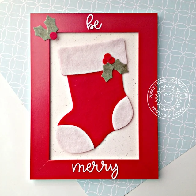 I stamped the sentiment from the Christmas Trimmings set on to every card with a grey ink and glued down all the elements. I also added some snow flakes (I die cut those with the mini free die you get with every order at the Sunny Studio Store) and some details with a white gel pen. Finally I cut out 6 thin stripes of pink pattern paper from the new Holiday Cheer 6x6 paper pack and I glued 2 of them on each card to create a pretty frame around my little scenes.
