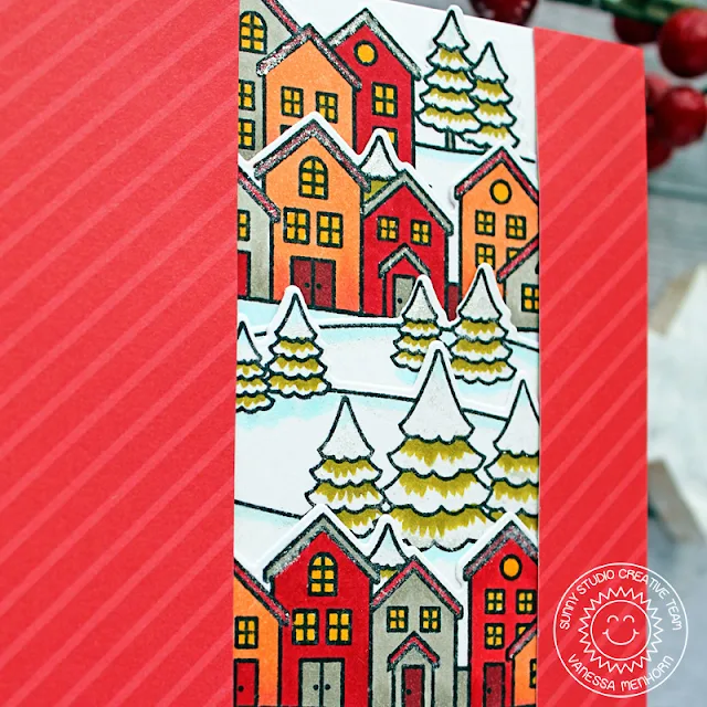 the roofs and the trees, I trimmed two strips from red patterned paper from