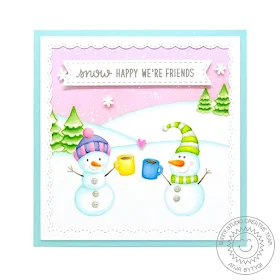 I think the sentiment is the perfect match for these snowman friends who share a cup of hot cocoa together. It's stamped in VersaMark Ink and heat embossed with Ranger Liquid Platinum Embossing Powder. I die cut a stitched banner and adhered it with foam tape. To finish off my card, I added White Clay Snowflakes and a Pink Clay Heart.