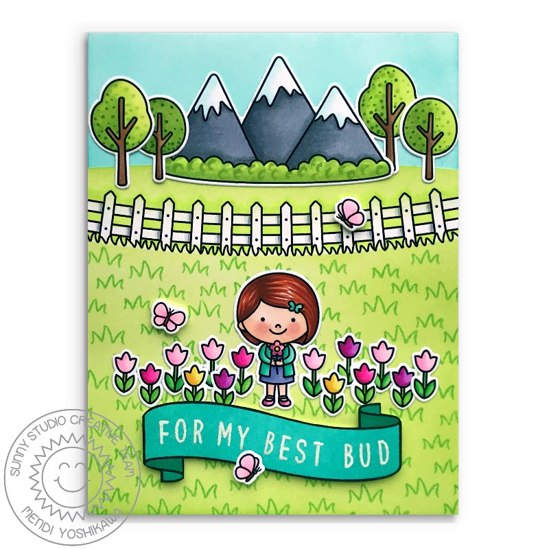 I love how you can color the one "hill" in the border to look like a little river going below the walkway like I did here or it can be colored to look like a sidewalk or a green grassy hill. For my card here, I colored my scene using Copic Markers in colors to match my strip of rainbow paper from our new Spring Fling Paper pack (to be shared more on Wednesday).
