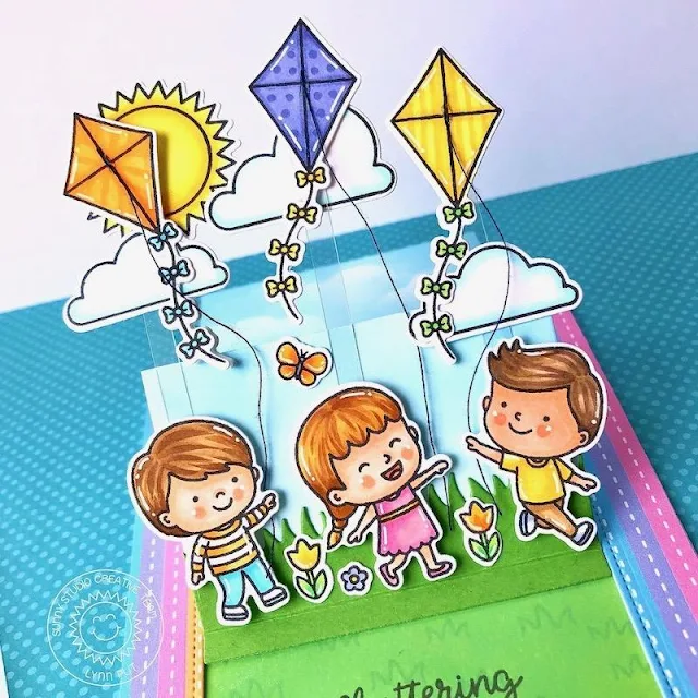 Love the pretty papers paired with the kite flying cuties! Fun rain shaker scene on the second card.