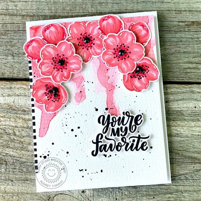 To create this card, I started off with a piece of watercolor paper cut to 4" x 5.25". I used Worn Lipstick Distress ink to watercolor a drippy background on the panel, concentrating most of the color at the top, then I tipped the panel on end and allowed the color to run down the panel a bit. When I was happy with the placement, I hit it with my heat tool to dry the watercolor and leave hard edges. Then, I added a splattering of black watercolor. I stamped several of the Cherry Blossoms in shades of pink and coral and die cut them with the coordinating Cherry Blossoms dies. I arranged them at the top of the panel and glued some down with a glue pen and popped others up with foam tape.