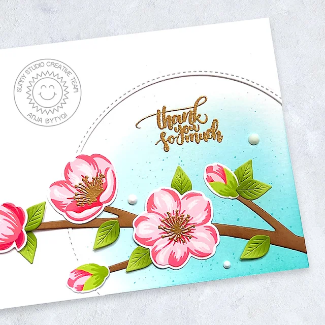 Next, I die cut the tree branch and leaves from brown and green cardstock. I added a little shading with a darker tone of ink. The cherry blossoms were stamped with dye inks and I heat embossed the pistils in Gold. I used the coordinating dies to cut everything out.