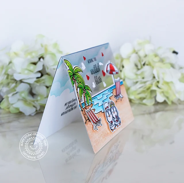 I stamped the ocean and sand border from Ocean View and die cut with the coordinating die, Ocean View Dies. I use the same coordinating die to die cut a backing for the back of the border using white cardstock. I then colored the ocean and sand border scene with Copic Markers. I added the adorable penguins from Wedded Bliss and a beach chair from Kiddie Pool Stamps.