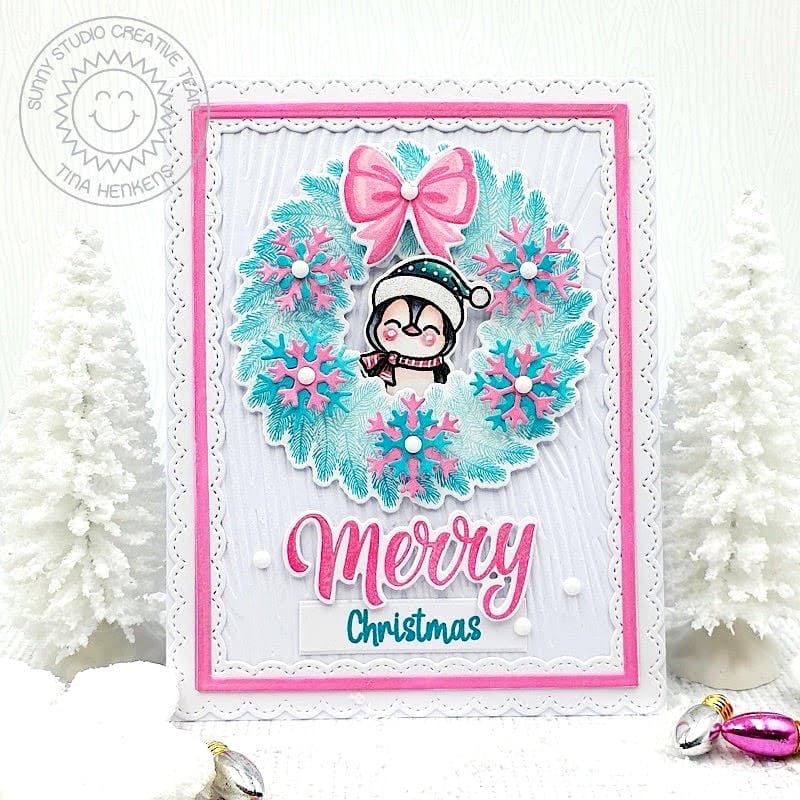 Hello crafty friends, it’s Tina and today I am creating with the new Winter Wreath stamp and die set! A beautiful layering set that you can use for so many occasions! Of course the wreath is gorgeous as is but there are so many cute critters in this holiday release that I just had to include an adorable penguin from Penguin Party.