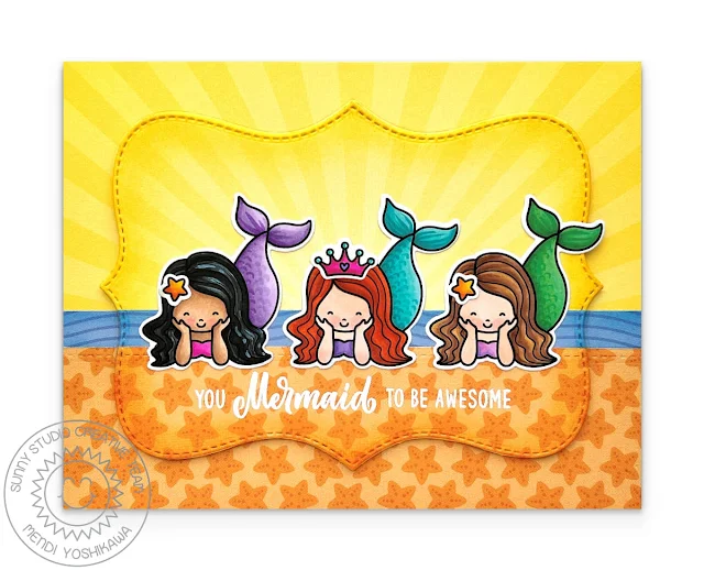 Card No. 3: Up next is a bright and happy card which came together really quickly and I just love how it turned out! I lined up three of the same mermaids in the pose where she is lying on her belly from our new Mermaid Kisses Stamps. This card isn't a scene card like the first two were, but I wanted to give the feeling that they are lined up together on the shore. I started by piecing together my card panel background using a yellow sunburst pattern from Classic Sunburst Paper for my sky and two prints from our Summer Splash Paper for my ocean and beach. To add interest between the layers, I added a stitched edge to the beach layer using our Ribbon & Lace Border Dies. After the layers were adhered together, I then ran the entire card panel through my die-cutting machine using the largest label die from our new Limitless Labels 1 Dies. When I was done, I inked up the edges of the label to make them stand out against the background and then cut another label from craft foam to help pop up my label and make it stand out even more. Once it was die-cut, the bottom portion of the label with the starfish print gave me a natural place to heat-emboss a sentiment from the set. I added my mermaids all in a row to the center of my card, alternating starfish barrettes and a crown for the middle mermaid.