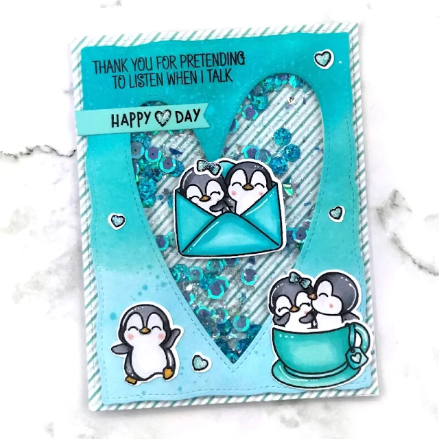 Card No.2: For my second card using the new Quill Cuties Stamps, I created a frozen pond for the hedgehogs to ice skate on. I started by adding the row of the snowy trees to the background using the stamped border from the Winter Scenes Stamps. I then inked a panel with tumbled glass distress ink for the pond and cut the top edge using the Winter Scenes Dies. Next, I cut a snowy hillside using the Slimline Nature Border Dies and added three more hedgehogs dressed for Valentine's Day to the foreground. Lastly, I heat-embossed the punny greeting from the set onto a red speech bubble from the new Speech Bubbles Extras Dies.