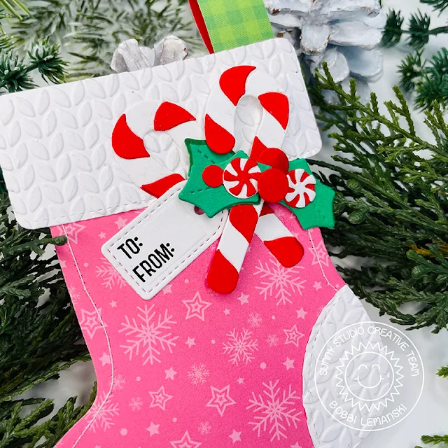 The first stocking is made from coordinated pattern papers from the Joyful Holiday Paper Pack. It features a large, stamped Holiday Greetings stamp sentiment, cut out using the coordinating dies. I added the holly and bow from the Santa's Stocking die set and a few peppermint candies using dies from the Gingerbread House die set. I embossed the white 80lb Neenah Solar White
